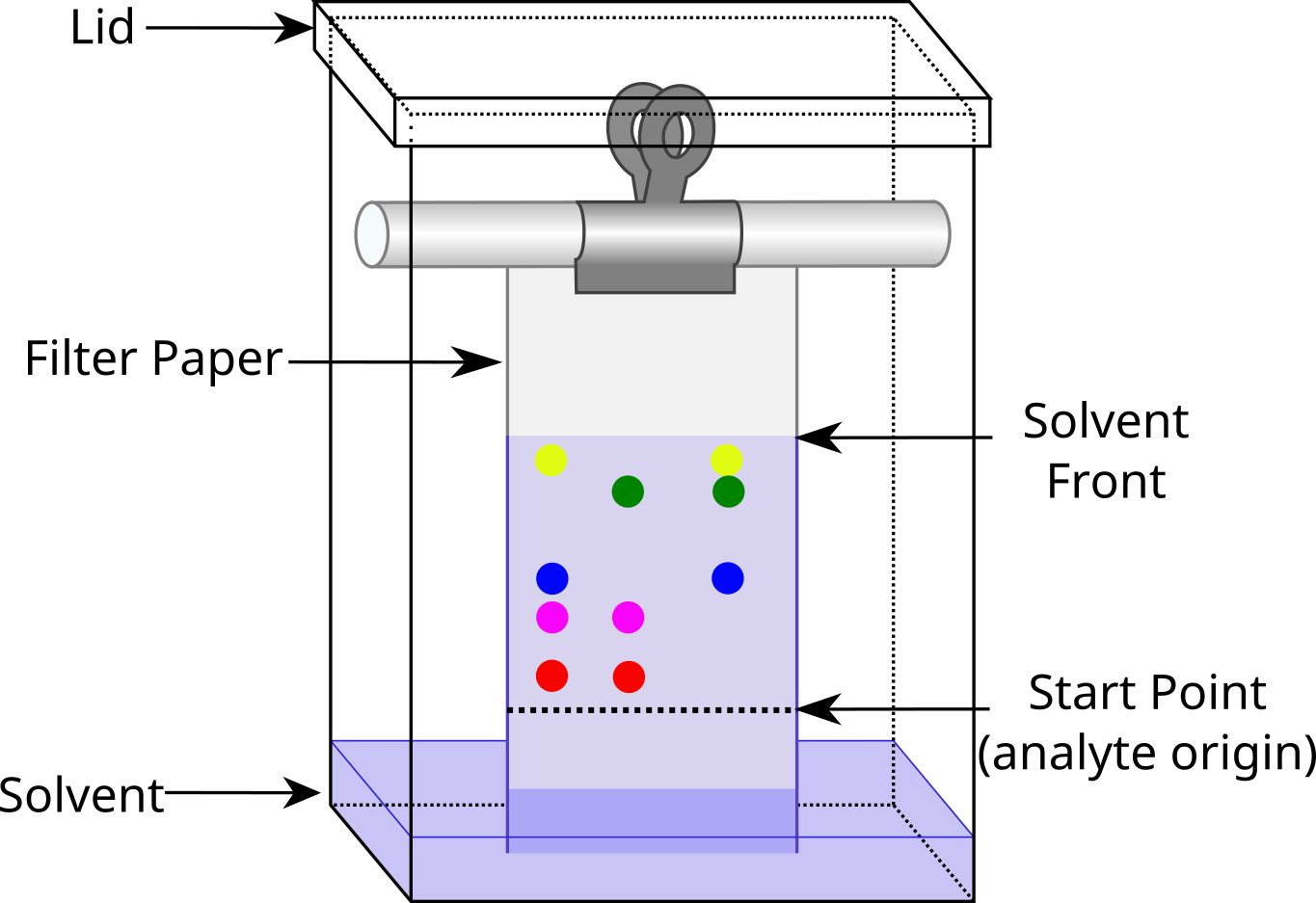 Хроматографія - це збірний термін для набору аналітичних прийомів, що використовуються для поділу сумішей. Chroma означає колір, а графік означає писати або малювати. Паперова хроматографія - це аналітична методика, яка використовується для поділу сумішей хімічних речовин (іноді кольорових пігментів) методом розділення. Папір в цьому методі називається стаціонарною фазою, оскільки вона не рухається і служить підкладкою або поверхнею для поділу. Аналіти (речовини, що аналізуються) відокремлюються один від одного на основі диференціальної спорідненості до розчинника. Розчинник розчиняється і переносить аналіти по матриці стаціонарної фази. Так як розчинник рухається через влагоотводящий дію, його називають рухомою фазою.