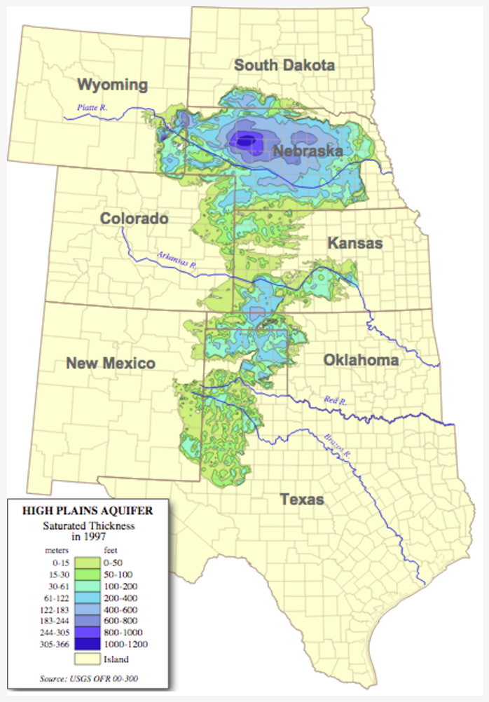 Малюнок 1. Насичена товщина водоносного горизонту Огаллала в 1997 році після декількох десятиліть інтенсивних відходів. Ширина і глибина водоносного шару, як правило, зменшуються з півночі на південь.