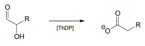 Це\(ThDP\) полегшене декарбоксилювання/Michael додаток з подальшим\(E1cb\) ліквідацією пірувату. Додаток Майкла - це назва сполученого додавання з вуглецевим нуклеофілом. (Дж. мол. Біол. 2010, 401, 253).